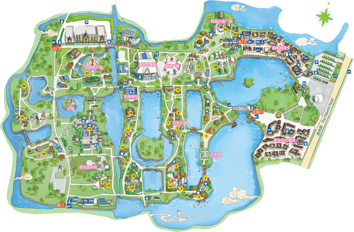 哈尼族是我國西南邊疆歷史悠久的農耕民族,人口約130余萬,主要居住在云南省紅河、元江、瀾滄江流域的無量山區和哀牢山區。哈尼寨占地15畝,展現了最具有代表性的蘑菇房和愛尼母子房,日月廣場;有表現哈尼族關于魚生萬物傳說的大型浮雕,有表現哈尼族遷徙傳說的圖騰柱;有體現生產生活的磨房、龍巴門、秋千場、梯田;寨神樹和祭石表現了哈尼族“萬物有靈、多神崇拜”的宗教信仰。哈尼傳統的節(jié)日有“年首扎勒特”、“苦扎扎”...